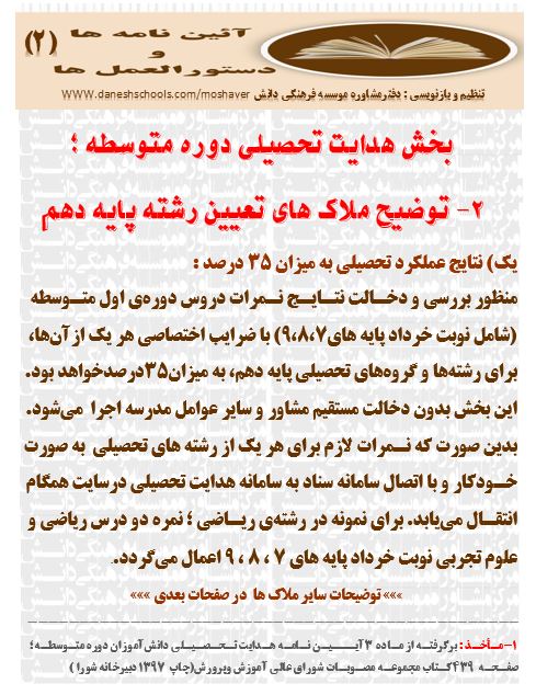 گزیده ی آیین نامه ها و دستورالعمل ها (1 تا 7 ) : بخش هدایت تحصیلی دوره متوسطه (قسمت یک) : فرآیند تعیین و انتخاب رشته از پایه نهم به دهم( ملاک های امتیازبندی)
