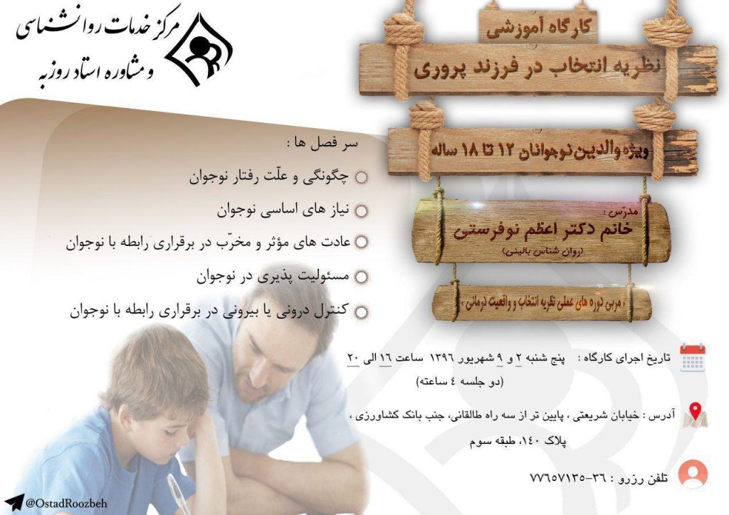 کارگاه آموزشی «نظریه انتخاب در فرزندپروری» ؛ ویژه والدین نوجوانان 12 تا 18 ساله