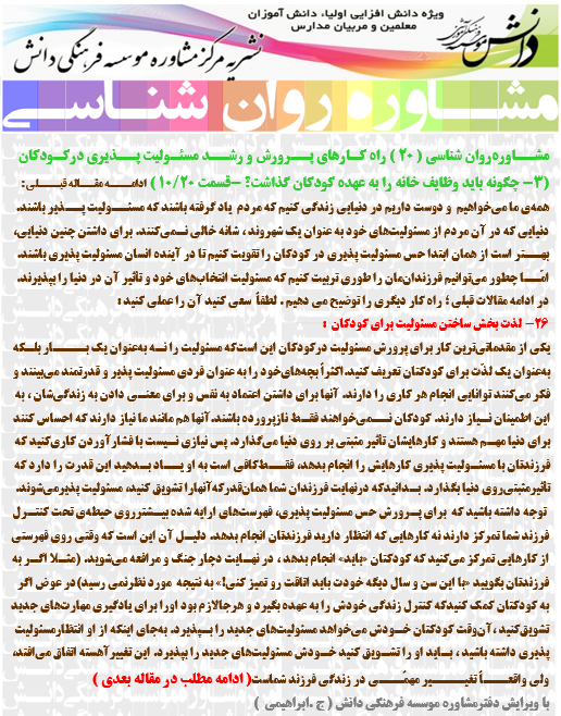 مشــاوره روان شناسی(30)راه کارهای پـرورش و رشــد مسئـولیت پذیری درکودکان ونوجـوانان:(3-چگـونه باید وظایف خانه رابه عهده آن هـا گذاشت؟(مقاله20/21)